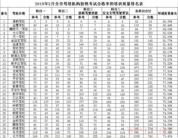 在记者拿到的这份《2019年2月全市驾培机构按照考试合格率的培训质量排名表》上可以看到,每所驾校的科目一、二、三都在统计范围内,并分别列出了每个科目的参考人数和合格人数。