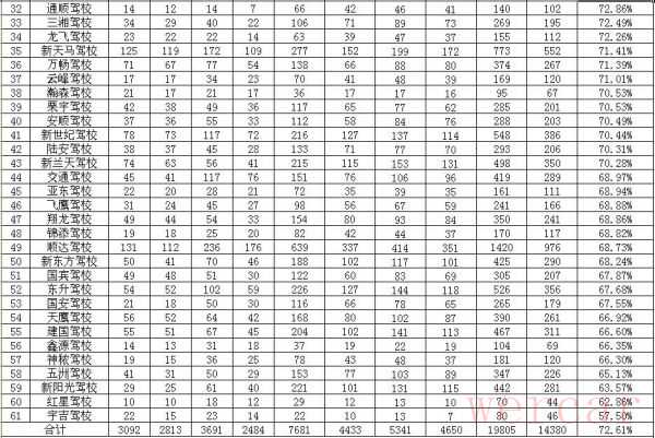 此次公布的质量排名表是综合科目一、科目二、科目三(包含道路驾驶技能及安全文明驾驶常识两项)的考试通过率,通畅驾校、金鹰驾校、醴陵天一驾校3所驾校分别以86.36%、85.44%、84.09%的合格率,排名前三。排名靠后的驾校则为新阳光驾校、红星驾校、宇吉驾校,其中宇吉驾校以57.5%的通过率垫底。