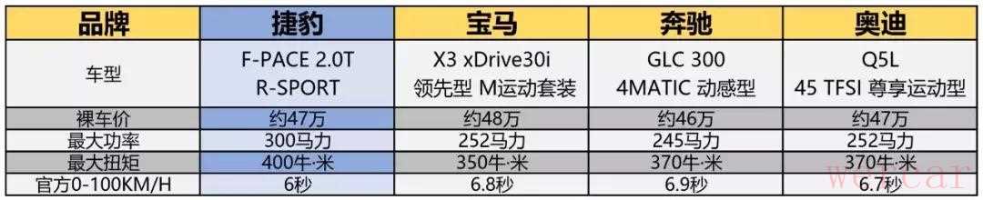 不过,你先别被标价牌上的60.8万吓到,因为F-PACE的性价比,只有你在走进4S店之后才能体现——目前,这辆捷豹F-PACE 2018款 改款2.0T 300PS 四驱R-SPORT运动型 终端裸车价在47万左右。这是什么概念,看下面的表格就知道了。