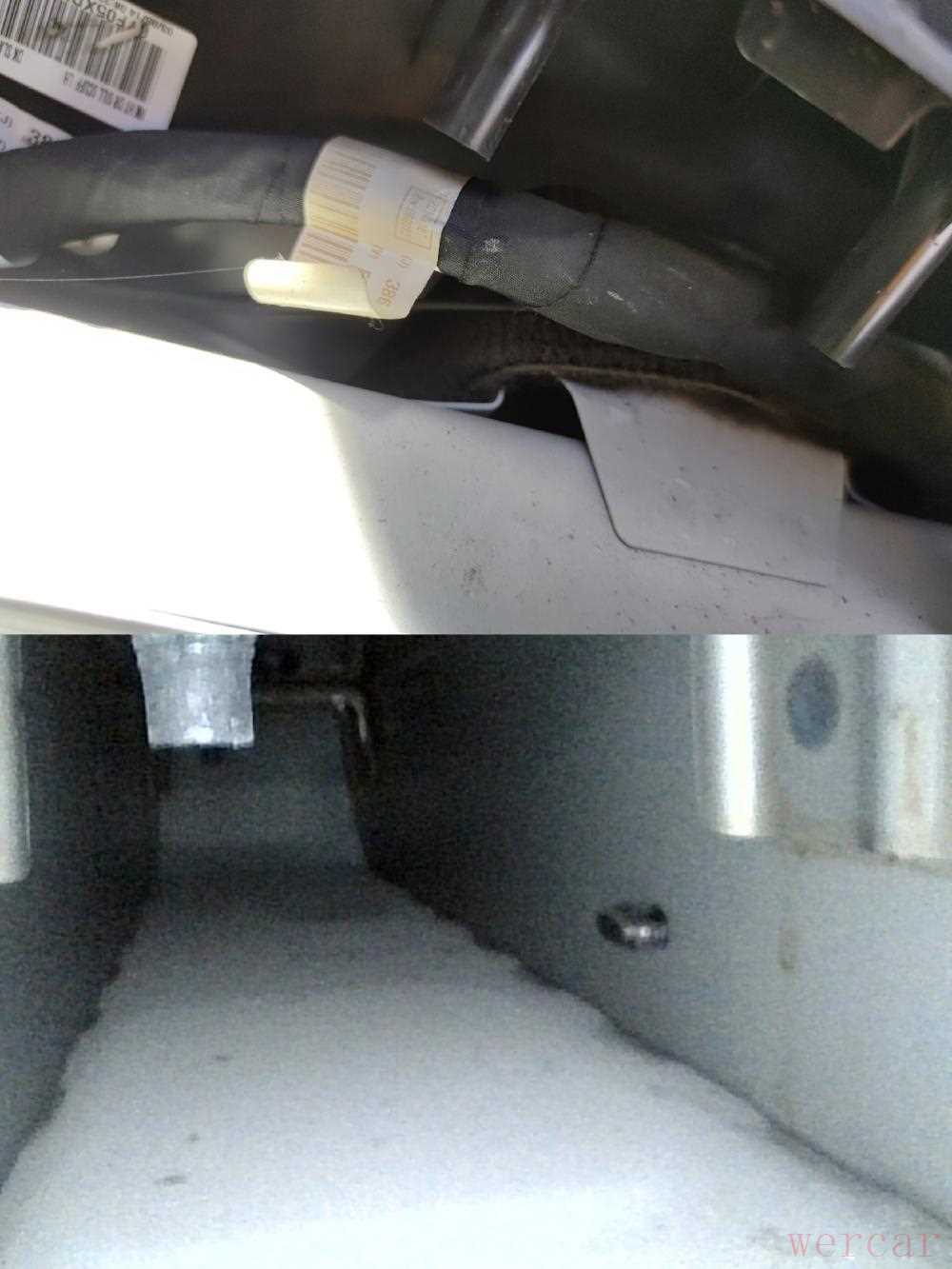 把门槛饰板拆开,查勘线束地毯没有问题,里面的空腔也很干净,这些全部检测完,可以排除车辆泡水的可能了。