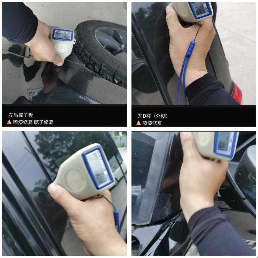 接下来检测车辆左侧,左A柱、C柱及D柱外侧全部都发现了二次喷漆的情况,左后叶子板还有钣金,通过这些柱子的情况来看,左前整个漆面应该是全军覆没了的……