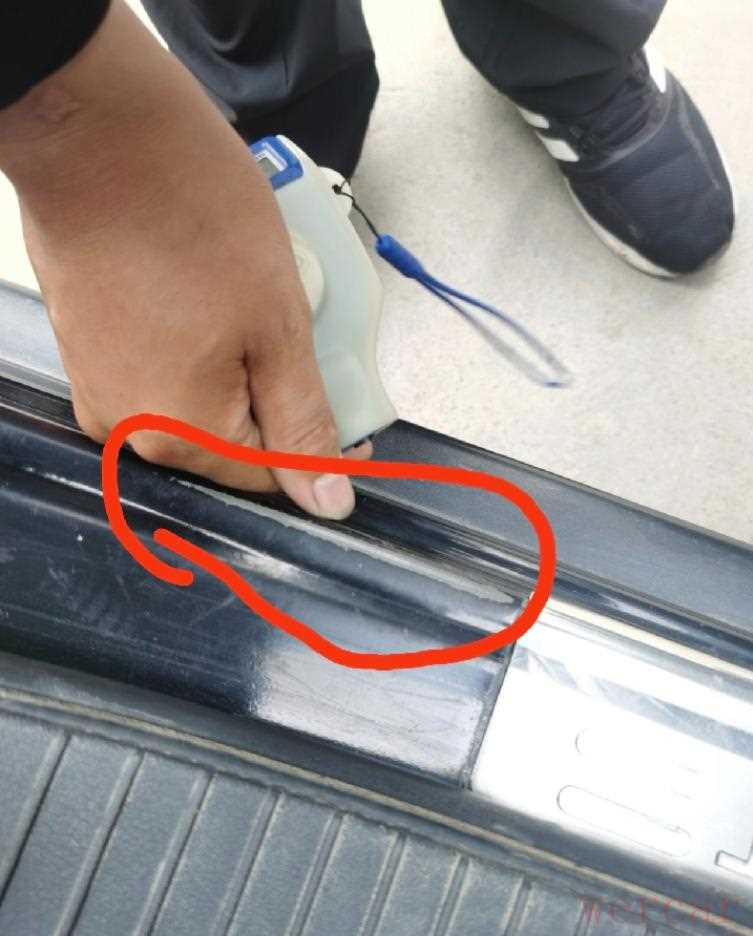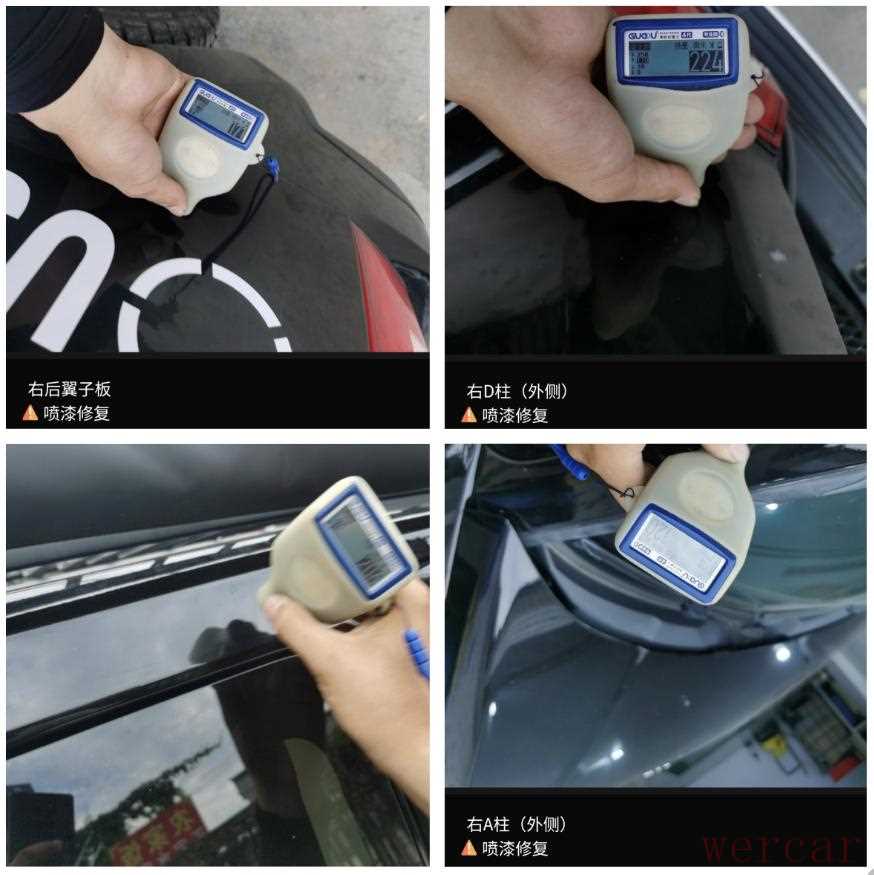 继续检测右侧,发现右后叶子板喷漆,右前A柱外侧、右C柱外侧也都有喷漆,进一步证明我开始的说法没错,这车就是除了车顶之外,整个一圈都喷过漆了,不过呢,重大事故点确实没有。