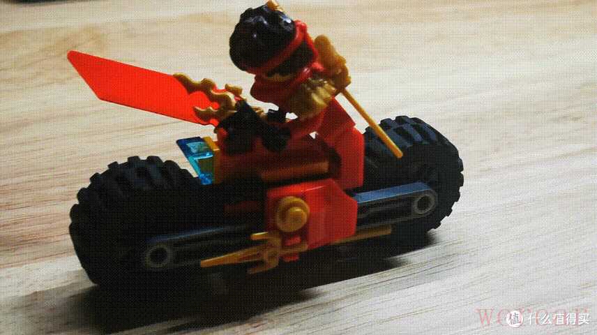 先拼凯的座驾:经典的红金配色,最吸引眼球的当属直径约3cm的宽体巨轮,采用橡胶轮胎+黑色轮毂的组合,不仅视觉上霸气十足,推动时还能感受到明显的顺滑阻尼感。车身上的金色刀剑和大面积的红色零件则巧妙呼应了凯“火系忍者”的元素设定。