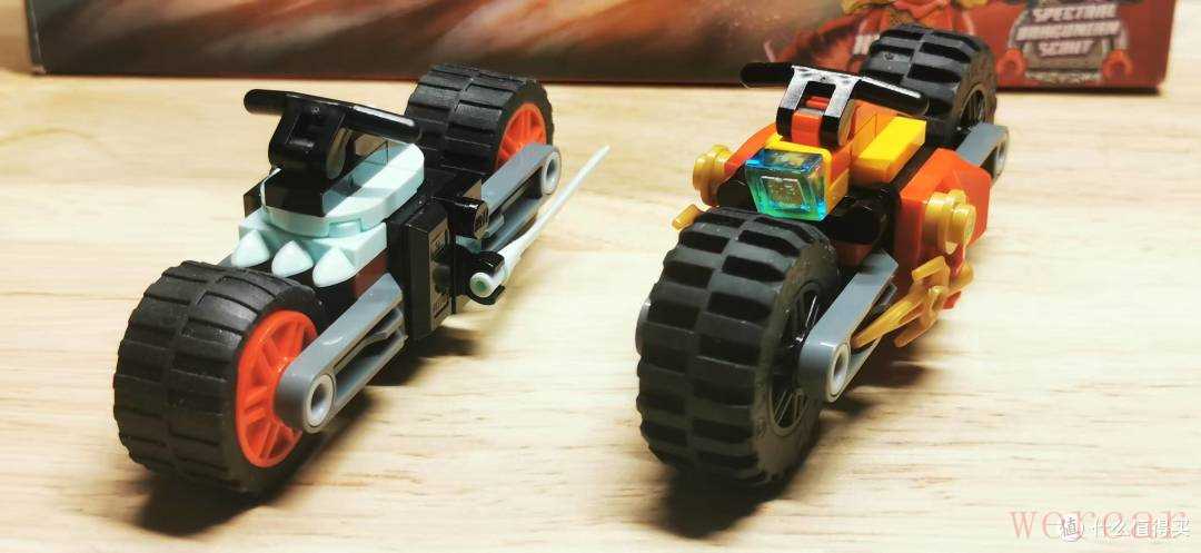 打开包装盒,两套独立分包的积木零件——乐高从塑料包装袋改成了更加环保的纸袋,主角凯的“火焰摩托车”和幽灵侦察兵的“侦察摩托车”,这种“正邪对抗”的组合设计直接拉满了代入感。