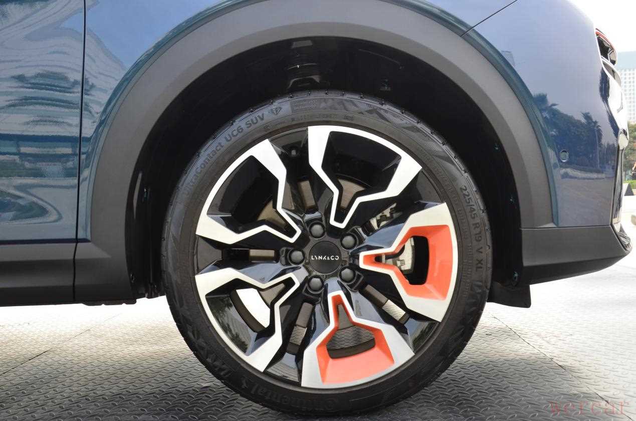 领克06的轮圈也颇有新意,橙色点缀的轮毂配色看起来时尚感十足,而轮胎的尺寸为225/45 R19,在同级车里算是比较大的了。
