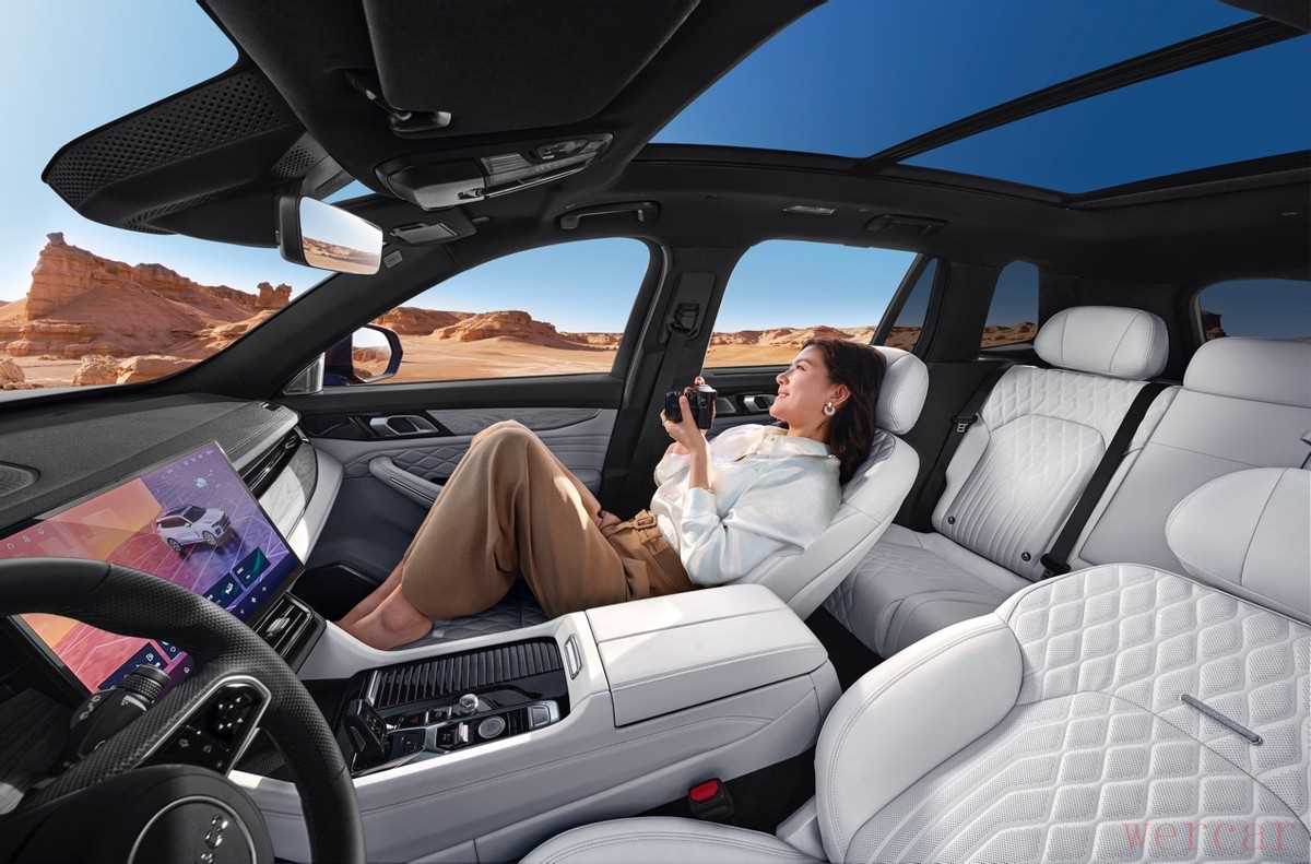在外观与空间设计上,新车新增暗夜紫、山野绿两种车色及20英寸光晖轮毂,五座布局更贴合家庭与多人出行需求。二排座椅宽度达1366mm,坐垫深度540mm,腿部空间最大1130mm,即便三人满坐也能保持舒适;新增的多功能中央扶手放倒后可切换为商务四座模式,二排小桌板则适配长途阅读、用餐或临时办公场景。全车覆盖Nappa真皮,前排座椅新增280mm一体式4向电动腿托,前后排均支持三档加热、通风及8点式背部按摩,搭配双层静音隐私玻璃、遮阳帘、14扬声器Bose定制音响与海洋之谜香氛系统,试图通过细节配置提升驾乘质感,未刻意强调“豪华天花板”,而是侧重解决长时间乘车的舒适性痛点。