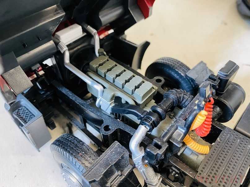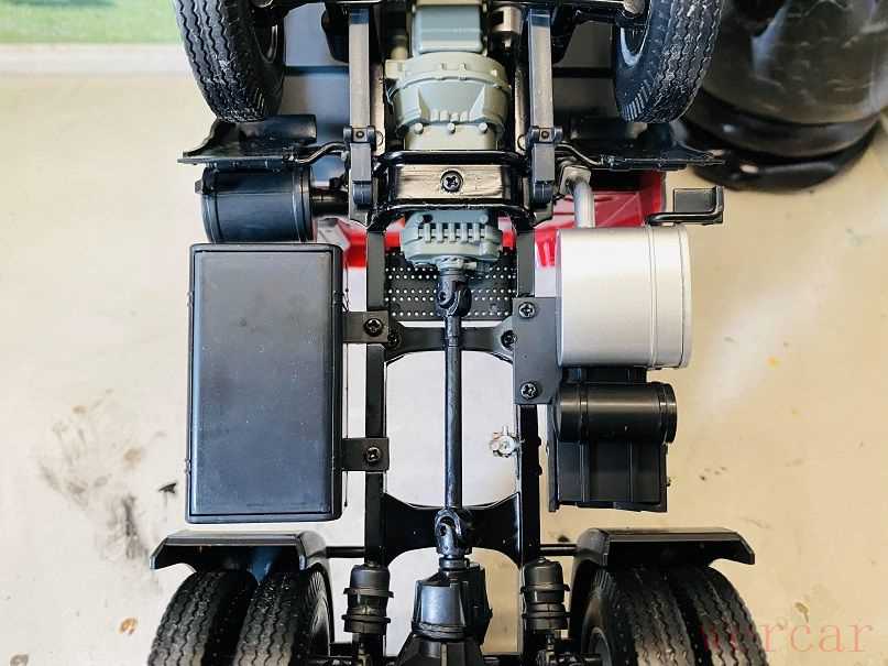 从底部看过去,传动轴使用了较细的还原设计,并没有如实车一样真实,变速箱的喷涂颜色与发动机本体一致,并没有刻意使用银色油漆进行喷涂,毕竟当时铝外壳变速箱也仍未被广泛推广,更多的重卡仍然喜欢使用铁外壳变速箱。