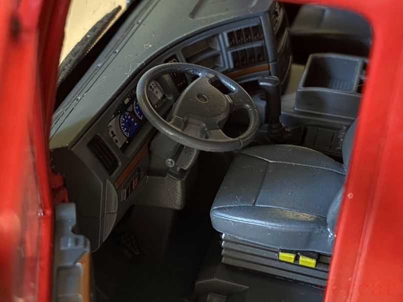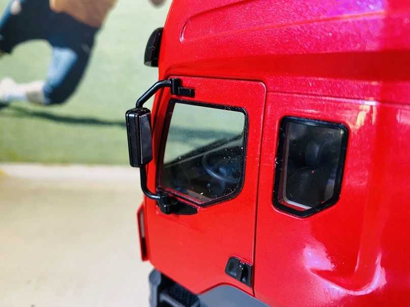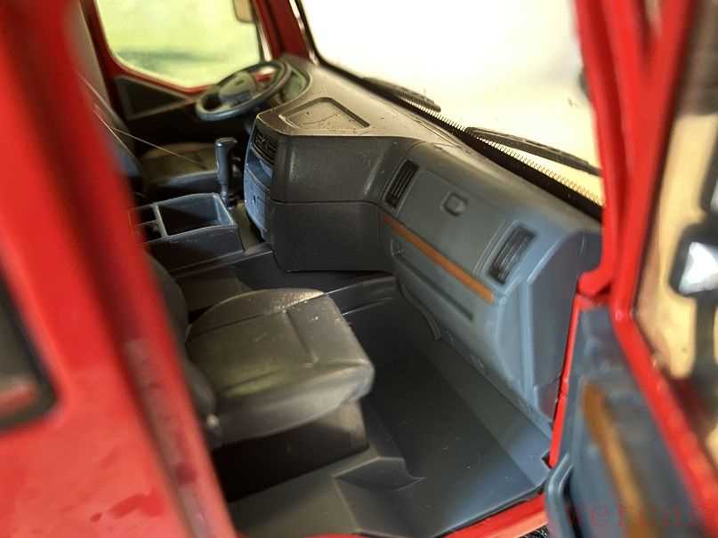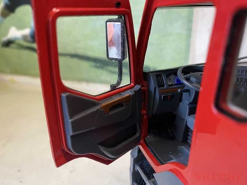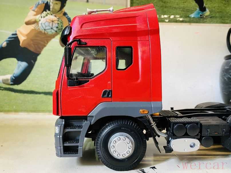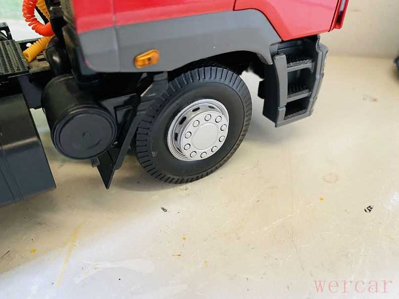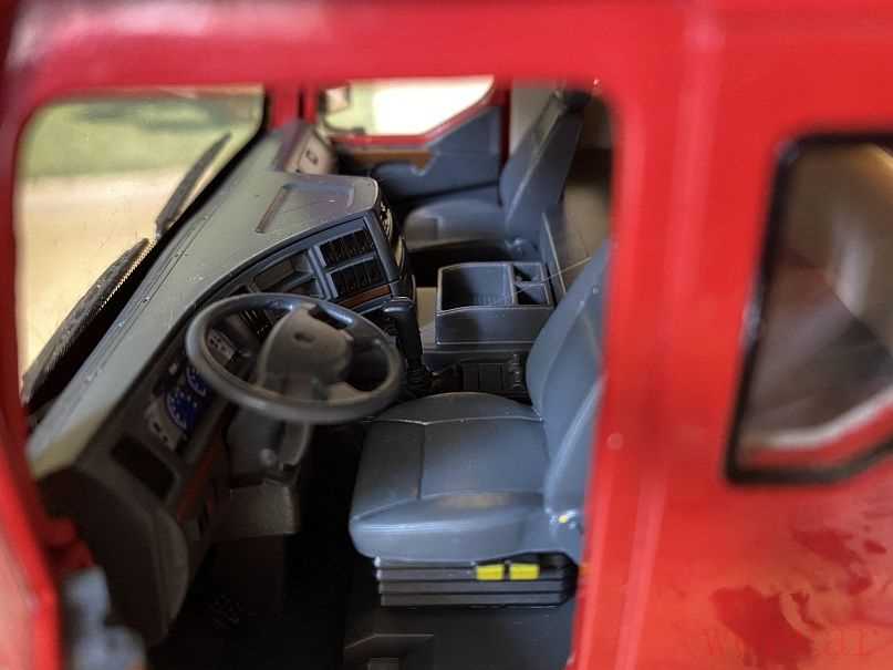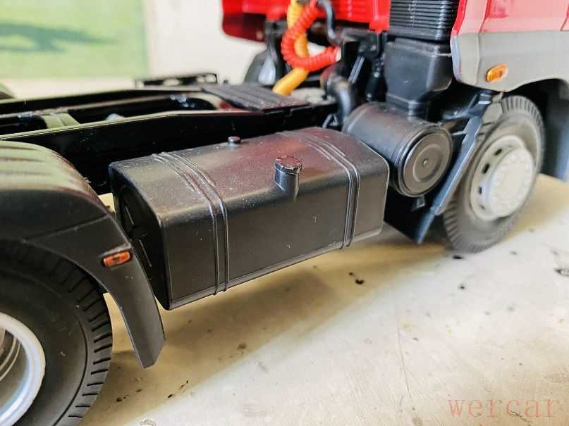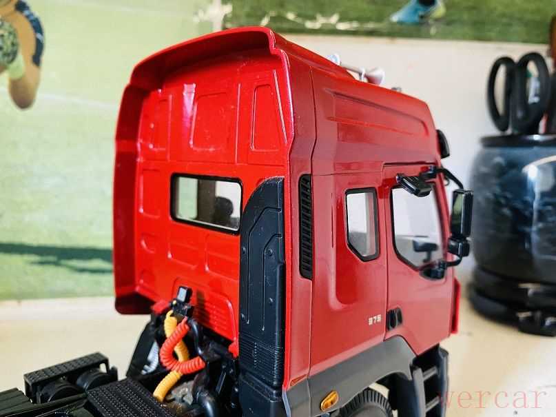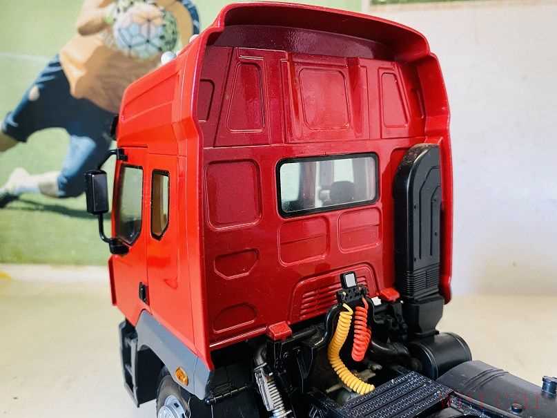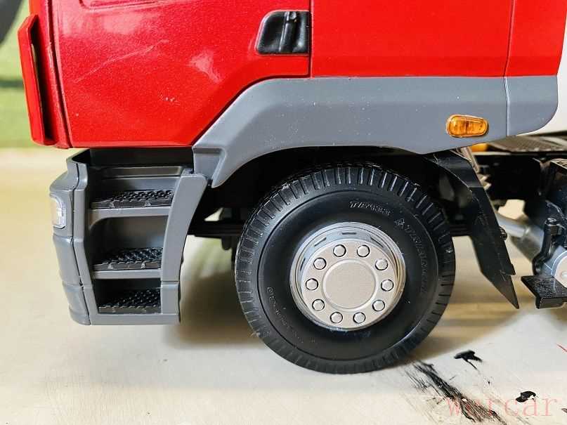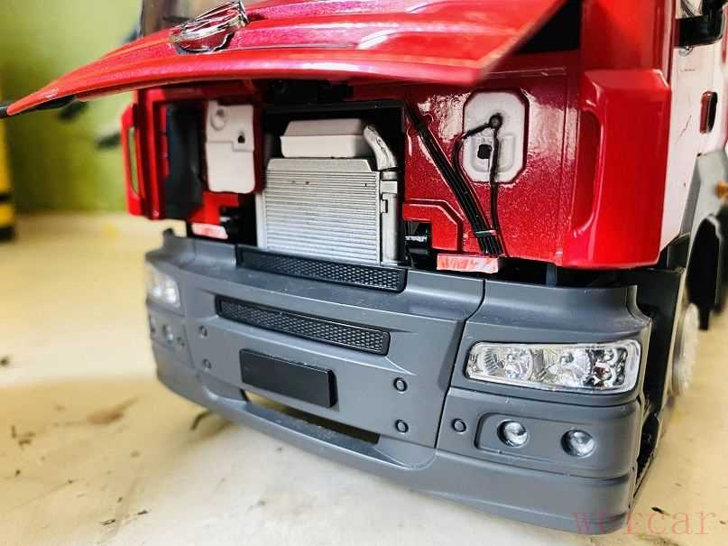 模型整体比例相比于之前的作品放大之后,并没有出现走形的状况,型准的程度把握得很好。驾驶室结构采用了与实车相同的红色喷涂,前保险杠与翼子板则喷涂了与实车相应结构相应的塑料灰色,但并没有采用塑料材质,而是用驾驶室保持一致的合金材质,能够最大程度保证结构强度,避免模型在日常运输和摆玩时出现损坏。