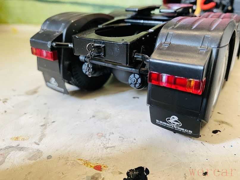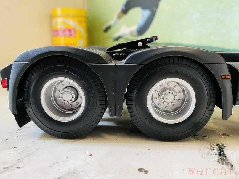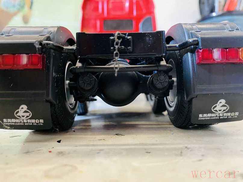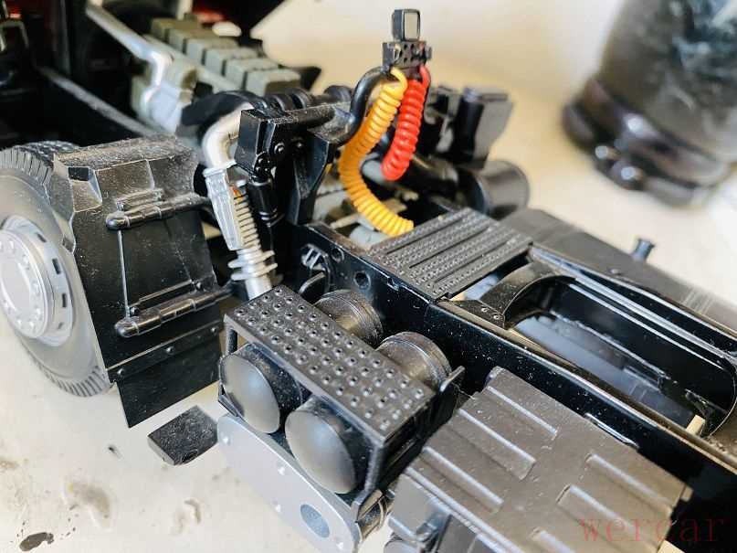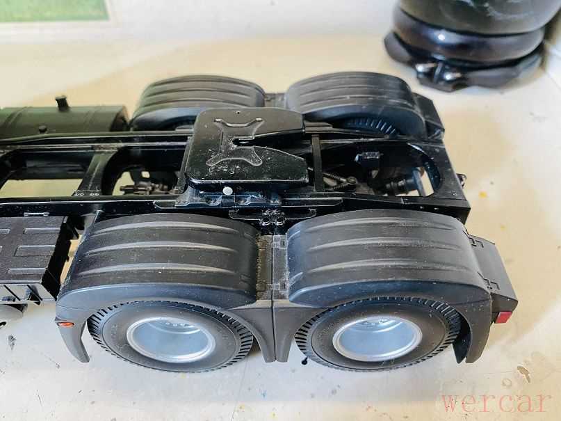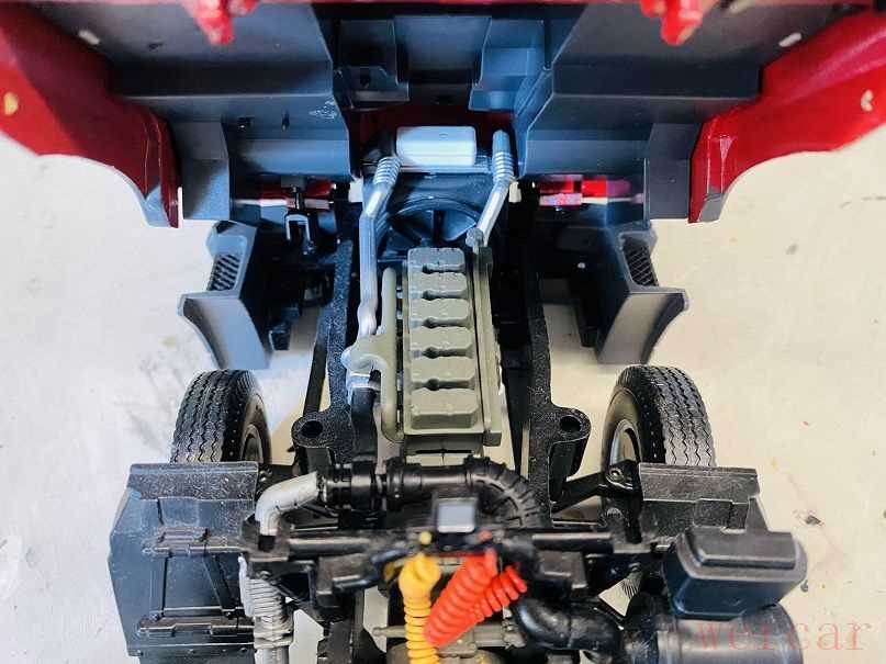 后车桥上刹车气泵的小细节、平衡杆的细节都被还原出来,并且较为牢固,看得出主机厂对模型厂做工的要求并不低。