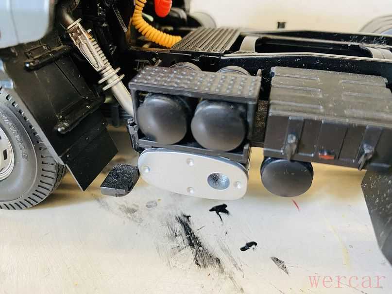 尾气处理结构倒是使用了集中后处理系统,安装在储气罐下方,这也是模型上所有底盘附件里唯一的仿铝合金喷涂还原的结构了。