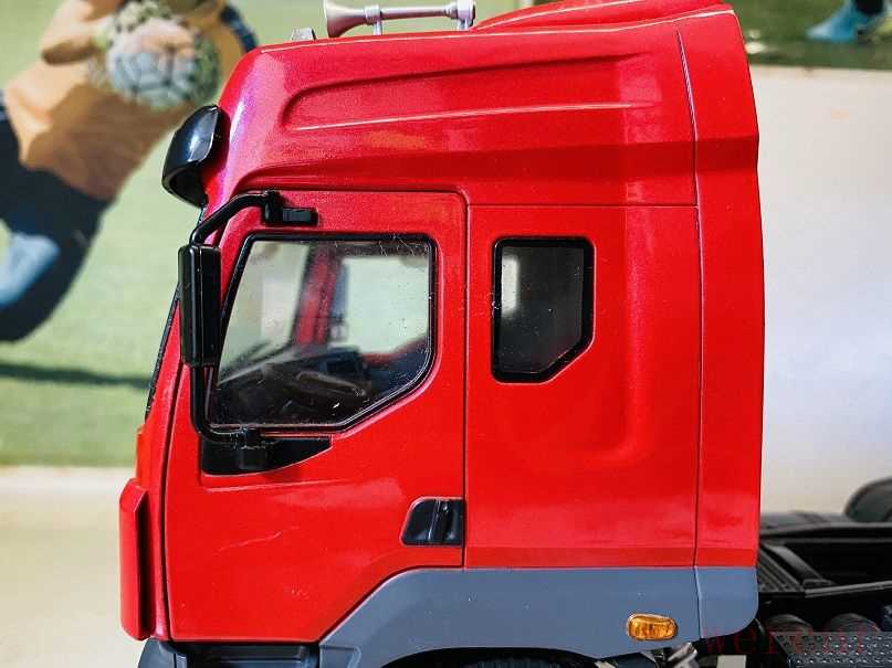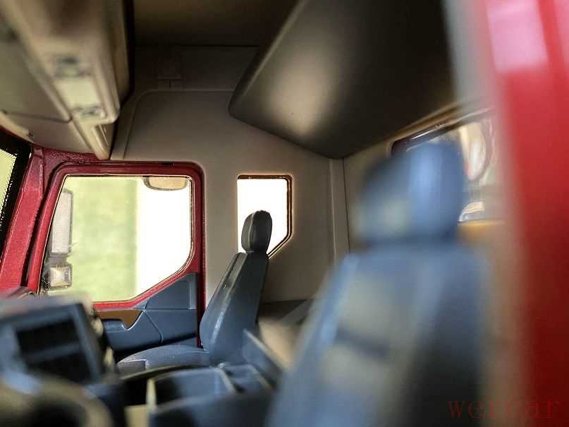 驾驶室顶部结构较多,包括顶部导流罩、外置气喇叭、天窗,以及车顶示廓灯。顶部导流罩与驾驶室本体一体成型,不能拆卸。外置气喇叭的结构非常具有欧洲风格,喇叭本体结构也较为精致,质量相对较好。但稍许遗憾的是,气喇叭本体结构相比与实车的比例偏大,安装在模型驾驶室顶上有些出神。车顶示廓灯的结构使用了透明塑料材质,并且灯内的细节也有很精细的还原。
