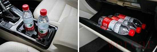 坐进车内观察发现车内的储物空间倒不是很多,挡把前方配备了一个不算深的储物格,平时放一些零钱以及手机刚好,而后方则有一个配有滑盖的储物槽,储物槽中配备两个杯架以及安放钥匙的储物格。手套箱采用双层设计,上层可以放随车的说明出等纤细的物品,而下层的空间可以同时放下三个饮料瓶还有富余,可见手套箱的储物能力相当出色。