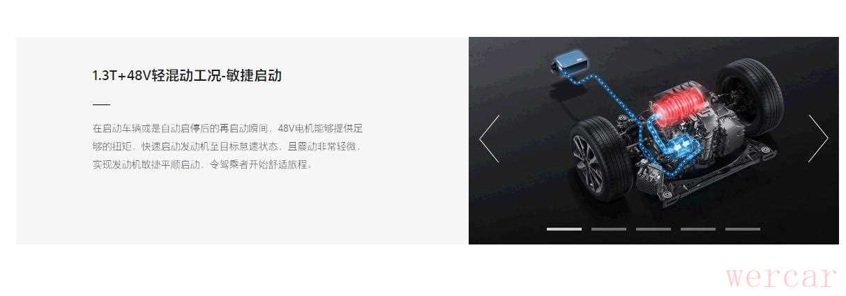 至于高配1.3t,还是三缸,但搭配了一个48伏的轻混系统,用“混动”来宣传可以进一步弱化三缸概念。在使用过程中,发动机会根据工况以及用户驾驶行为,自动完成敏捷启动、电动助力、智能充电、能量回收、电动怠速等一系列工作。在降低油耗的同时,也进一步让动力的响应性有所提高。