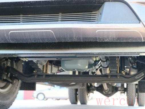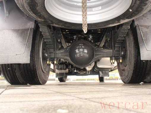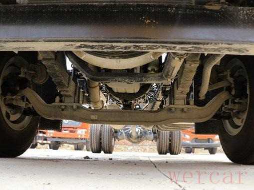 配备有六条型号为TR668的双喜轮胎,规格为10.00R20,这款轮胎主打良好的道路适应性、静音能力以及高耐磨能力,适用于中长途货车全轮位使用,有良好的多路况通过能力。底盘为前7后7+6钢板弹簧悬架结构,承载能力得到保障。车重7.905吨,可搭载长6750mm,宽2460mm仓栅式货箱。另外车配备了300L的钢制油箱,长途续航能力较弱。