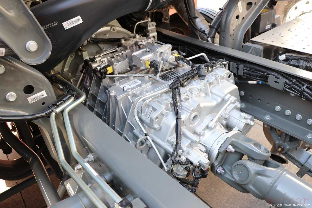 实拍车型采用中国重汽自主研发的HW10C-WY十档AMT变速箱设计,最高档为直接档设计,最高档速比为1。油箱尺寸为600升,后桥型号为MCJ11BGY,速比为3.91,在发动机处于1200-1600rpm经济转速之间,其最高时速可达到57-80km/h,同时还可选装重汽最新的S-AMT16无忧换挡变速箱。