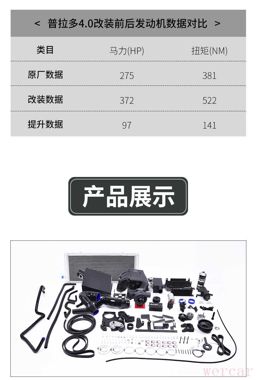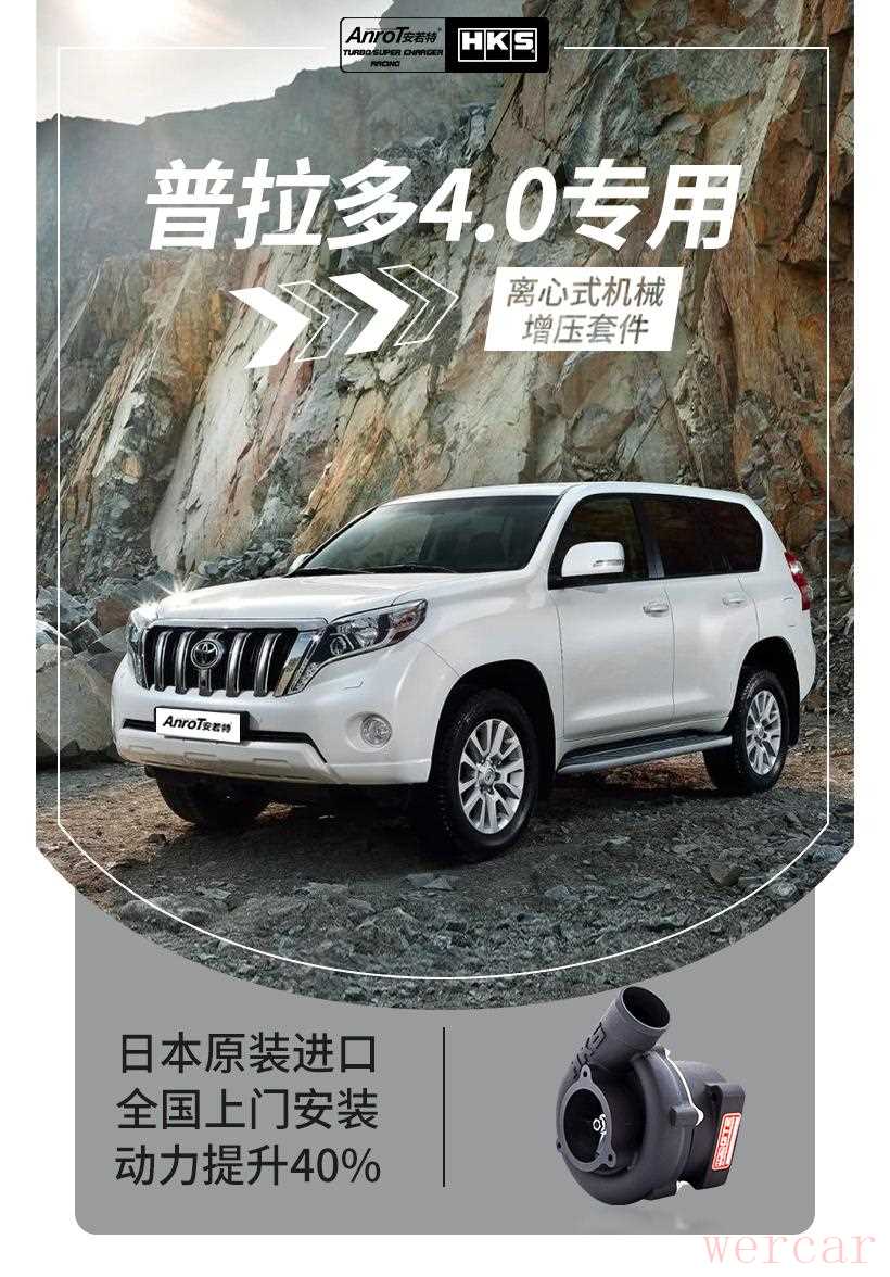 全国上门安装VX:ANROT_HKS 经过HKS机械增压的加持后,普拉多4000的最大马力提升到了372匹,扭矩提升到了522牛米,0-100加速只需7.6s,这样的动力足以达到5.7L的动力效果了。