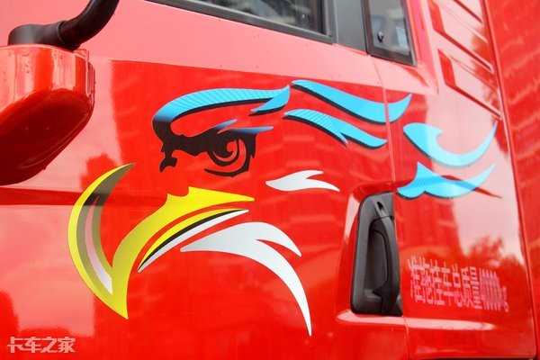 有意思的是,实拍该车侧面还设计了一个类似于解放J7上的常见的鹰头拉花,目光犀利,但这个鹰是由五种颜色构成,很是好看。