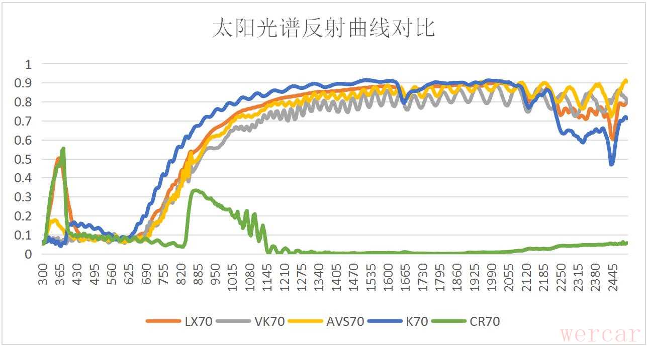 咱们再一起看一下中凌K70,红外线波段(横780-2500)的反射率比较高,同时可见光(横轴380-780)的反射率也比较高。说明它的光谱选择性做得不够好,为了提高太阳能总阻隔,提高了可见光的反射率,牺牲了驾驶安全性,这是不可取的。