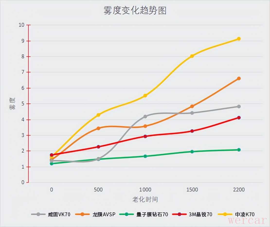 观察雾度变化趋势图,中凌K70雾度最高,达到了9%,龙膜AVSP雾度次之,量子膜钻石70雾度指数最小。雾度反映了太阳膜的清晰度,而清晰度和驾驶安全息息相关!