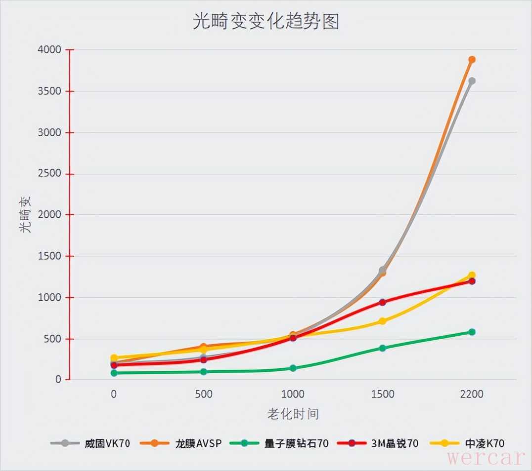光畸变变化趋势图中,龙膜AVSP和威固VK70变化极为明显,相较于初始值上涨了14倍!