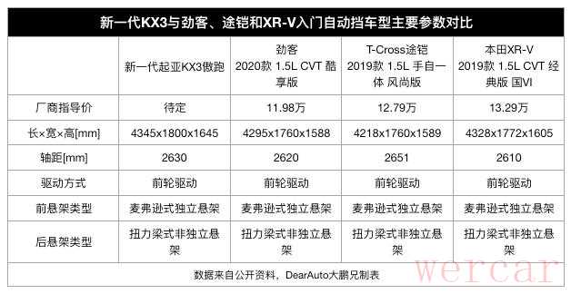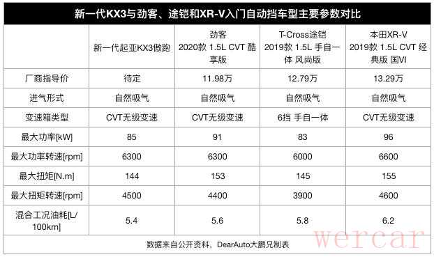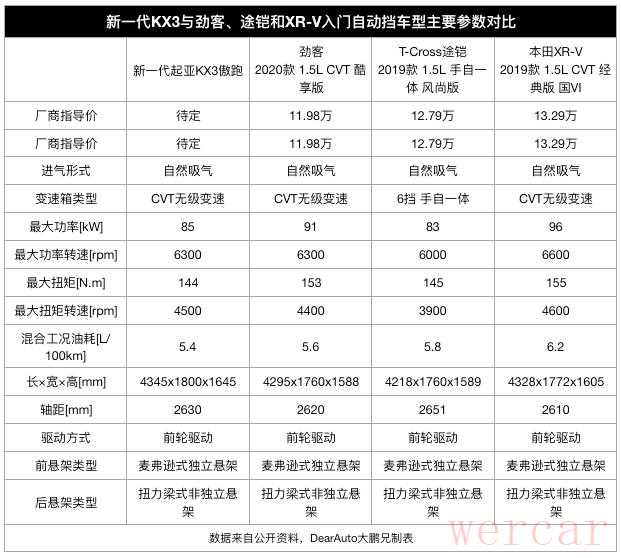 讨论性价比,首先是价格。KX3和刚上市的现代ix25(10.58-15.28万元)基本是同平台、同技术,即将于本月下旬上市的KX3,价格可以参考后者。当然了,起亚定价一般是低于现代的,所以大鹏兄大胆推测1.5L+CVT的KX3,预计9万多点。这价格比劲客、途铠、XR-V怎么样?