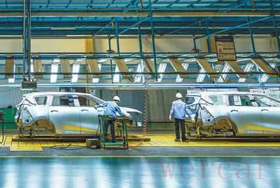 在海南省海马汽车海口基地的焊装车间内,工人进行流水线作业。 康登淋摄(影像中国)