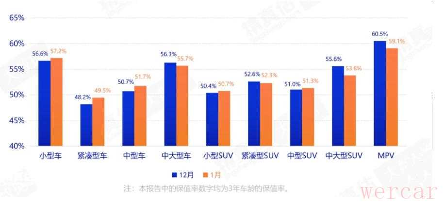 在新能源车方面,《报告》显示,1月新能源二手车保值率渐趋稳定,保值率稳定的根本原因是行业集中度提高。其中,插电混动车型和纯电动车型保值率分别为47%和45.3%。