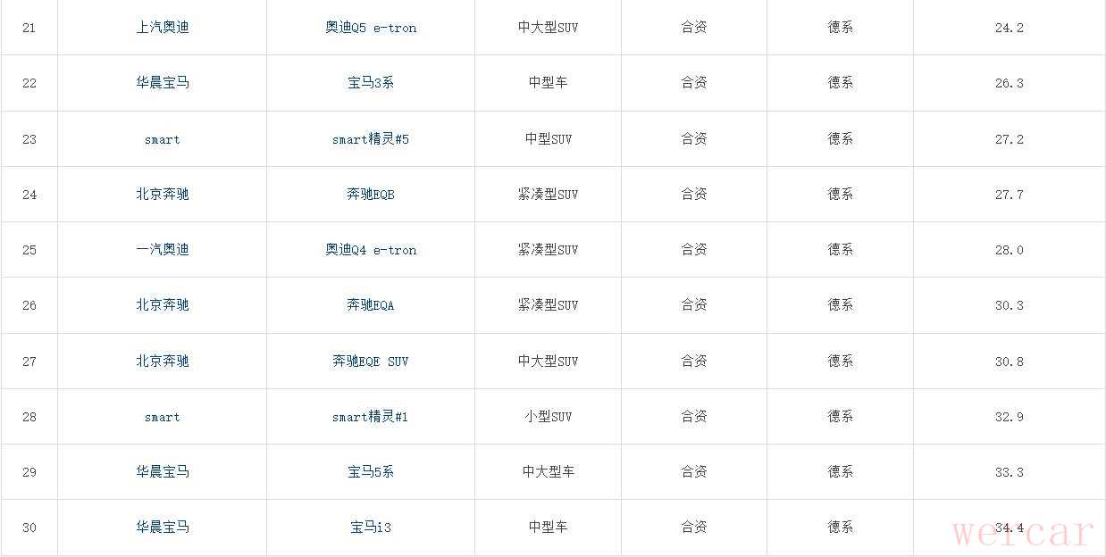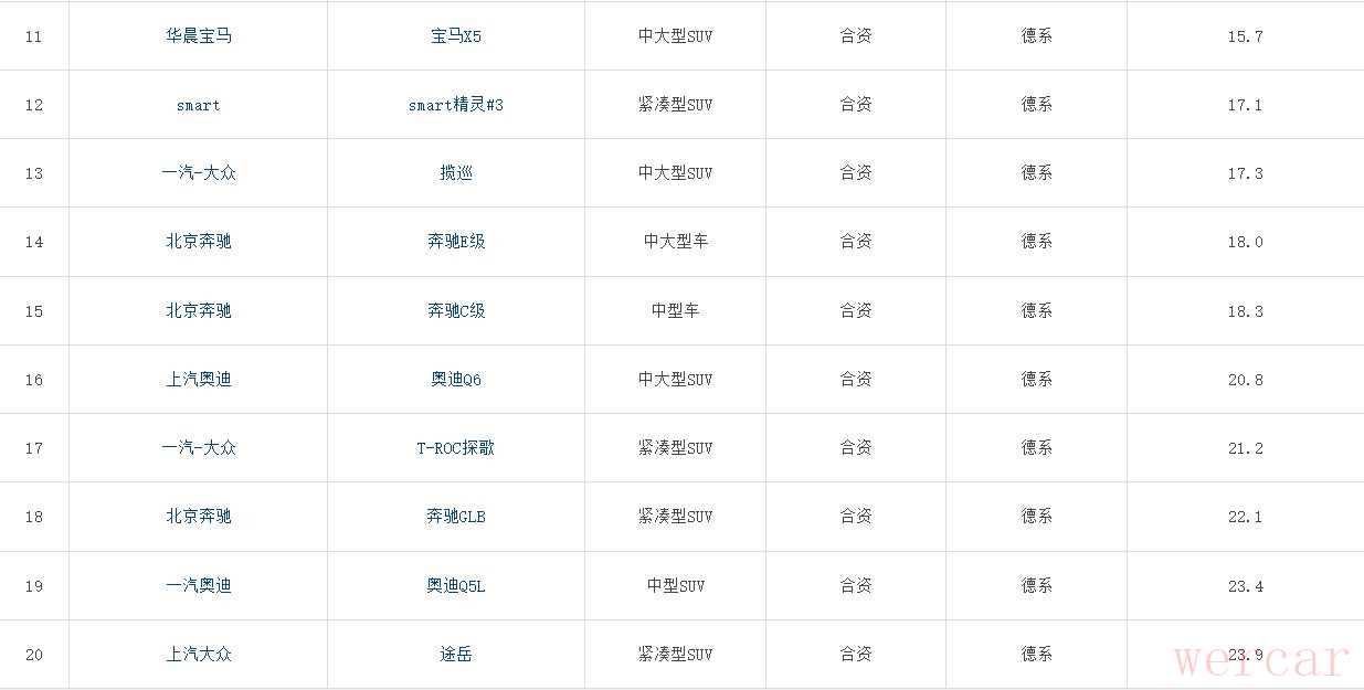 排名11至20位的车型组成了德系车市场的中坚力量。宝马X5、smart精灵#3等车型保持着15-17的投诉比,表现可圈可点。大众揽巡、奔驰E级和奔驰C级这三款不同定位的车型投诉比集中在18左右,显示出德系豪华品牌在质量控制上的一致性。奥迪Q6、大众探歌等SUV车型的投诉比控制在20-23之间,虽然不及头部车型亮眼,但整体表现仍在合理范围内。这个区间的车型大多是各自品牌的主力产品,其品质表现直接影响着品牌的市场口碑。