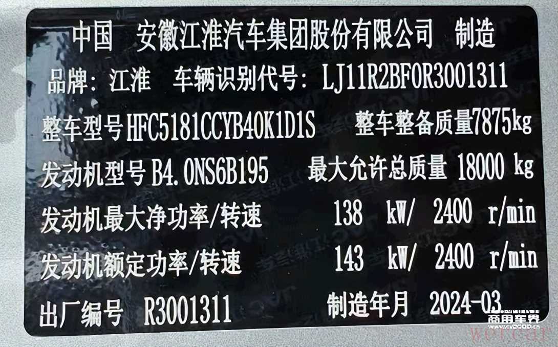 该铭牌显示车辆2024年3月出厂,发动机最大功力138KW