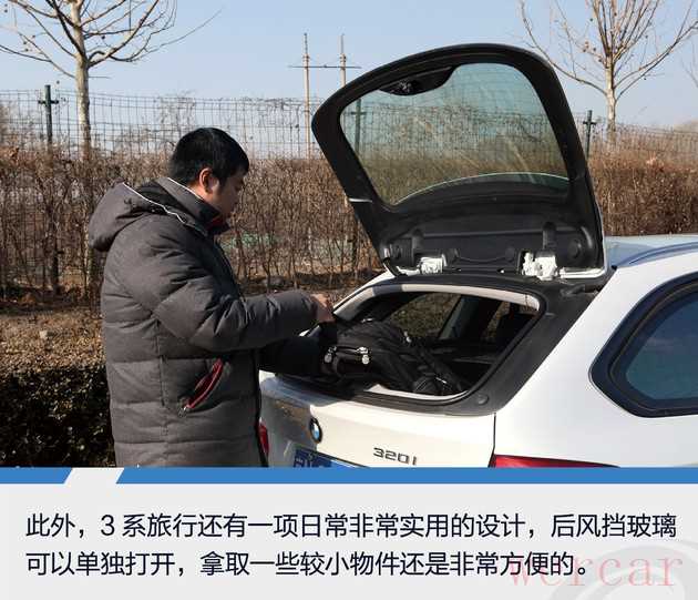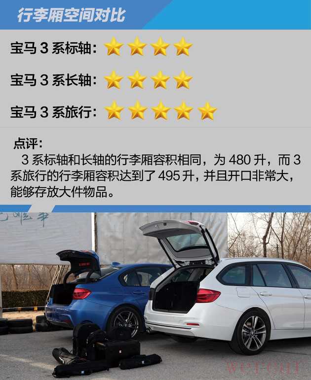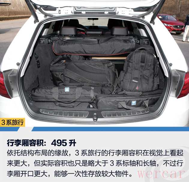 3系标轴和长轴的行李厢容积同为480升,而3系旅行版的行李厢容积达到了495升;在行李厢空间对比项目中,我们准备了较大的行李厢、日常用的背包、摄影背包以及三脚架等,有较大的物件也有较长的物件。通过最后的装载对比发现,3系标轴以及长轴装载能力相同,而3系旅行凭借较大的开口和较大的容积,行李厢储物能力最出众。