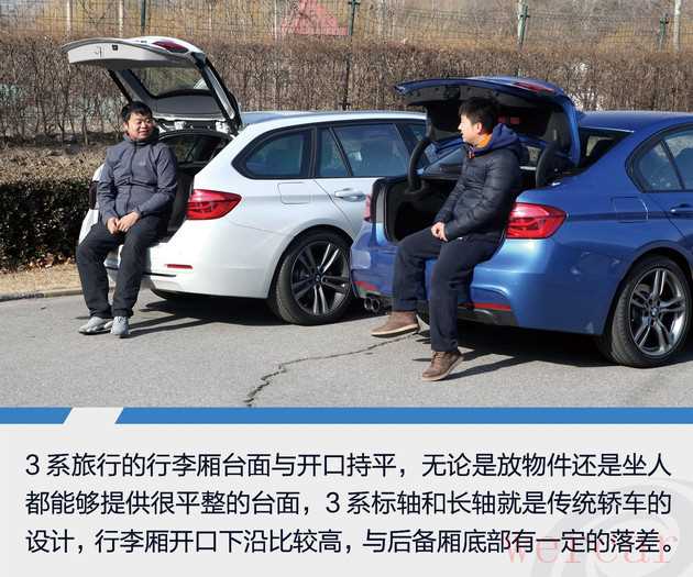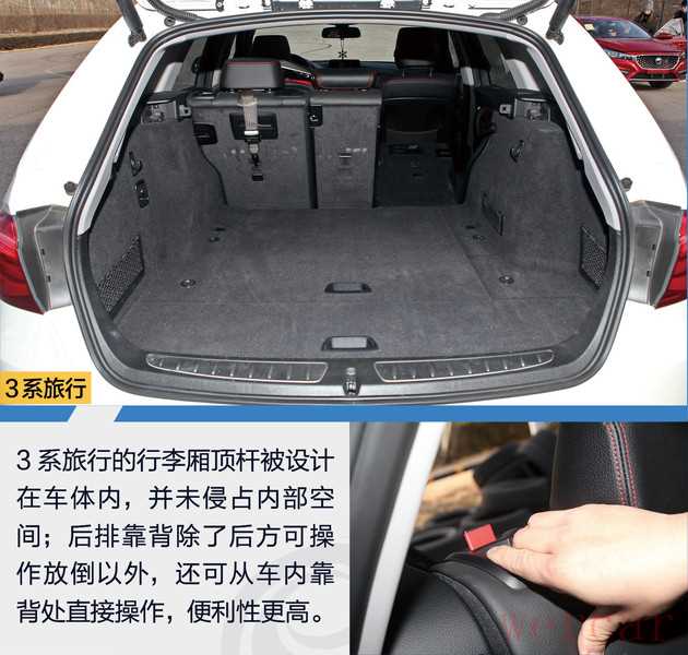 另外,3系标轴和长轴的后备厢空间地台平整度一般,主要是因为行李厢两侧略有凸起,避震器塔顶导致整体的规整度并不如3系旅行。而3系旅行的行李厢并没有塔顶以及后备厢盖扭杆来侵占后排空间,无论是底部平整度还是两侧都非常的规整,并且由于行李厢盖开口范围较大,能够存放较大物件。