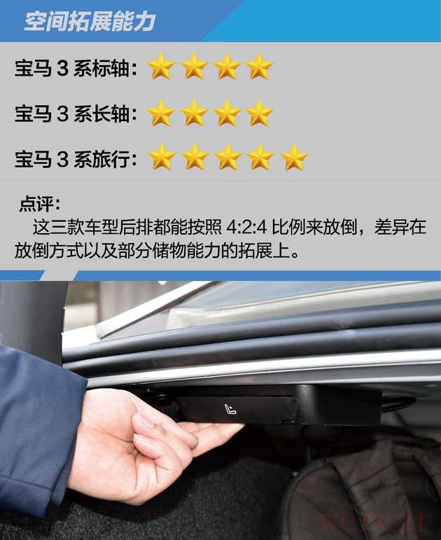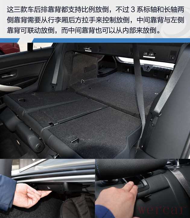 在空间拓展能力方面,三款车型的后排座椅都能够按照4:2:4的比例来放倒,其中中间靠背和左侧靠背可以联动操作,通过行李厢后方的拉手可以放倒,中间靠背也可以单独从车内来操作放倒;而3系旅行除了具有3系标轴和长轴的操作方式之外,还可以从车内靠背上方的开关来操作,也就是说拿取后备厢的行李时,行进中从车内也可以拿取,便利性更高。