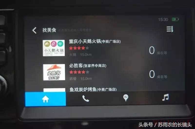 找加油站、吃饭是开车游玩时最常见的需求。百度Carlife系统也相应拥有“去加油”、“找美食”等功能,操作也相对简便。但唯一遗憾的是,百度Carlife系统所推荐的加油站、美食场所都是列表式的,只显示了距离,没有通过地图指示相应位置,不是太直观。