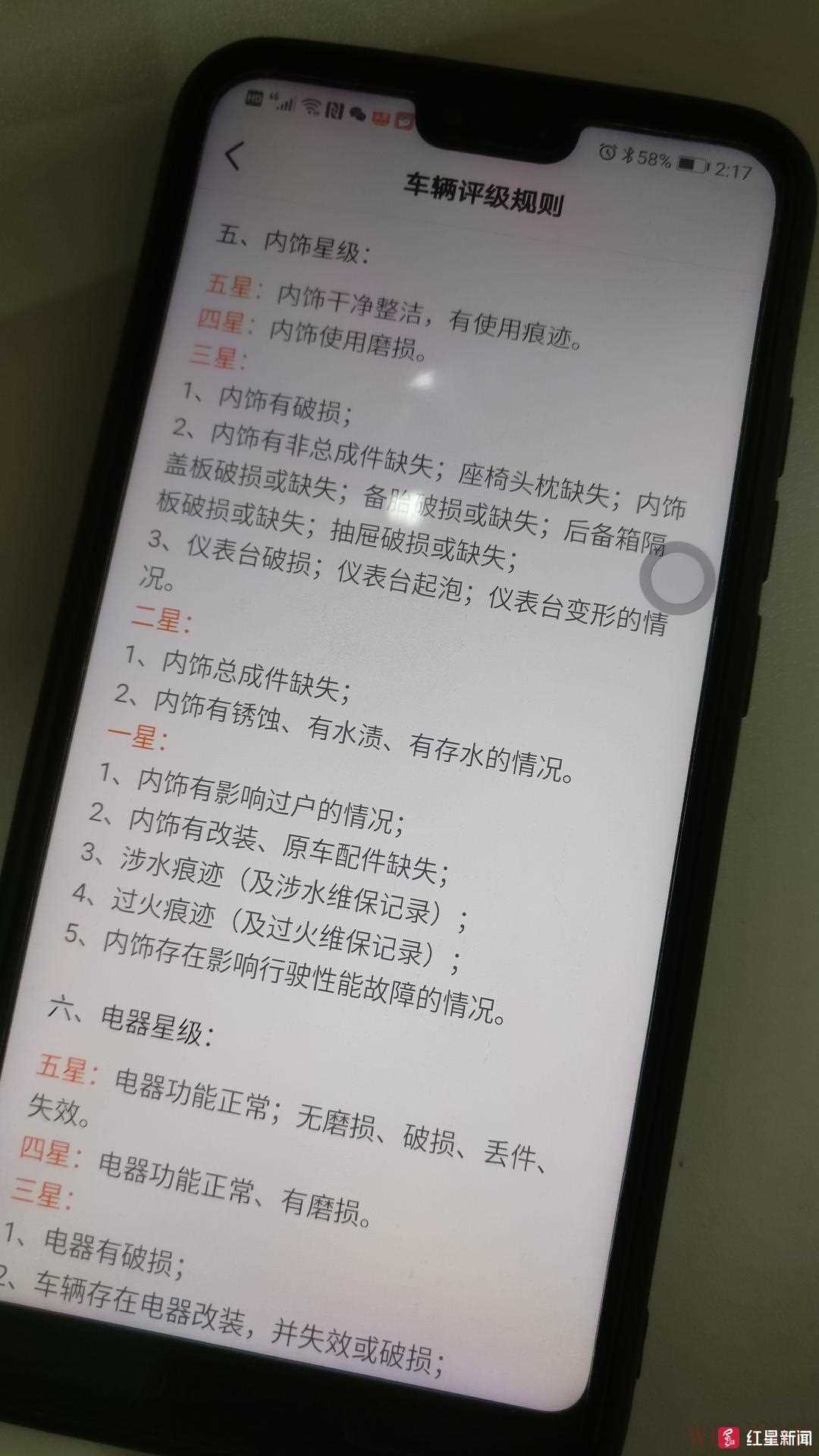 颜先生认为,优信拍上对这辆车的车况信息不全面。他对于内饰及附件的二星评级耿耿于怀。红星新闻记者注意到,“优信拍”的说明页面里,“二星”意味着“内部总成件缺失、内饰有锈蚀、有水渍、有存水的情况”,而“一星”标准则有明确“涉水痕迹(及涉水维保记录)”的描述,“要是打的一星,我也会更加慎重的。”