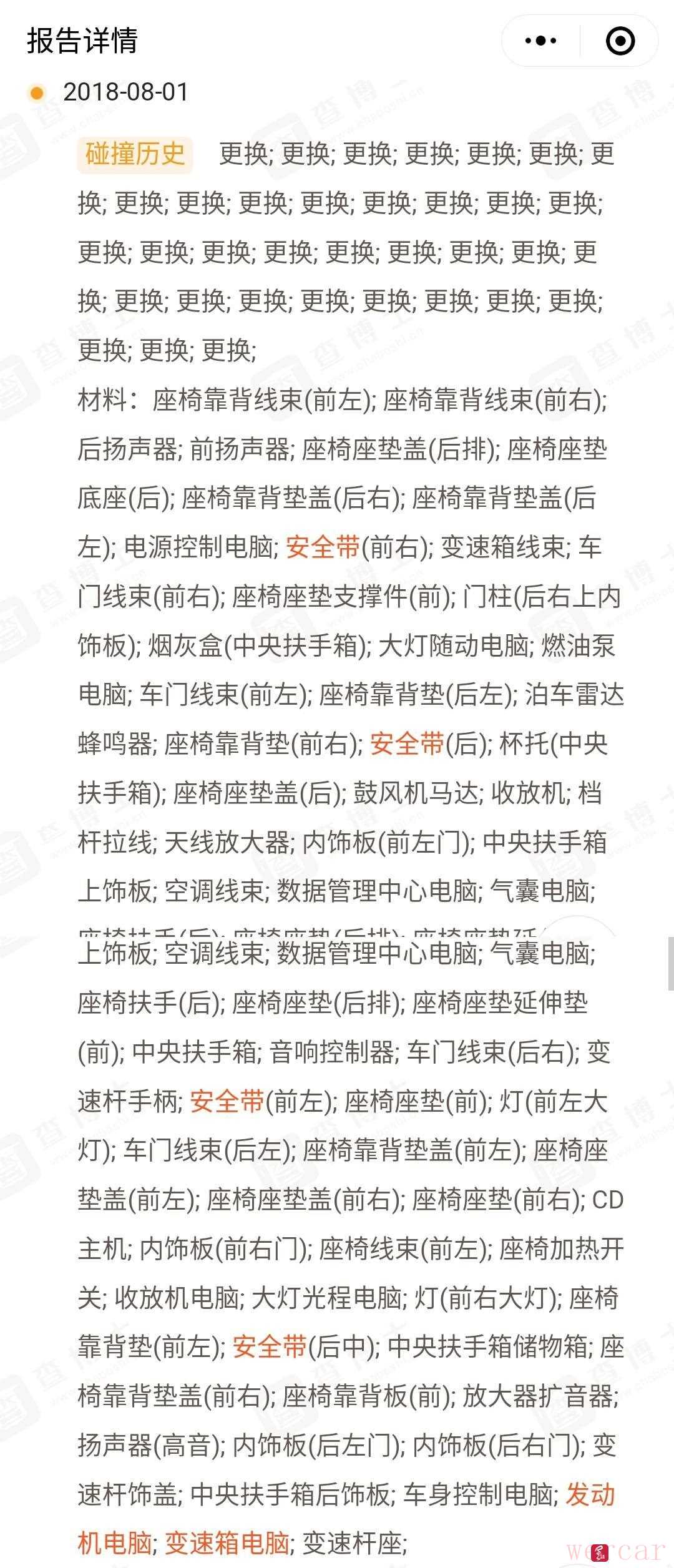 看到报告后,颜先生觉得:“这么多电子元件被更换——一般来说,坏也不会这样大规模的坏。”他举例,“比如线束,是被覆盖件遮住的,只有在车被水浸泡以后,才有可能出现进水和需要换掉;另外,安全带根部一般很难进水,汽车一般也不会拆地毯。”他从二手车车商的角度说:“如果我们知道这些信息,八成不会收这辆车——我们会认为这辆车有涉水的经历,大概率是‘泡水车’。”