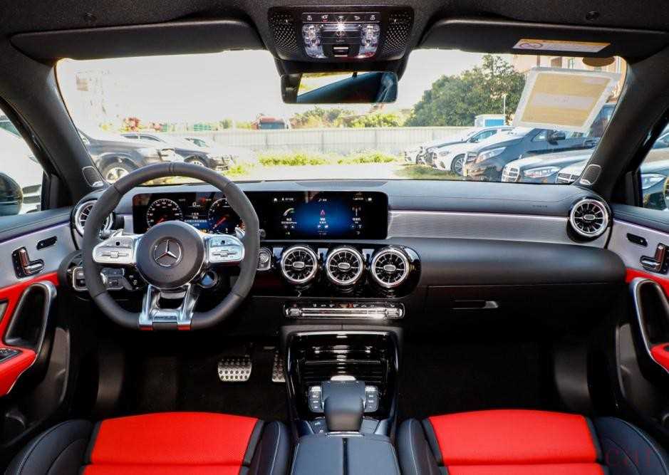 内饰部分,和纯电车型相比,燃油车的内饰设计上收敛很多,整体走得也是豪华的感觉。T字中控,采用的是常见的对称式设计,空调出风口为圆形造型,数量多达到五个,这是奔驰高端车型上才有的配备,辨识度很高。方向盘上面有皮质材料包裹,还有红色点缀,观感时尚,握感舒服。当然,视觉效果最好的当属双联屏设计,目前也是奔驰家族车型上常用的配备。功能方面,内置了行车记录仪,还有自动泊车功能,新车变得更加好开。