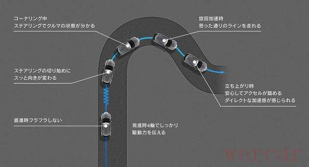 此外,还新安装了扩大后轮转向角的动态后轮转向系统(DRS),以及根据车速使后轮与前轮反相或同相转向最大 4 度的机构。不仅可以小半径转弯,还可以小转向角使汽车转向。为了实现这些驾驶性能,可以选择专门开发的 21 英寸轮胎。