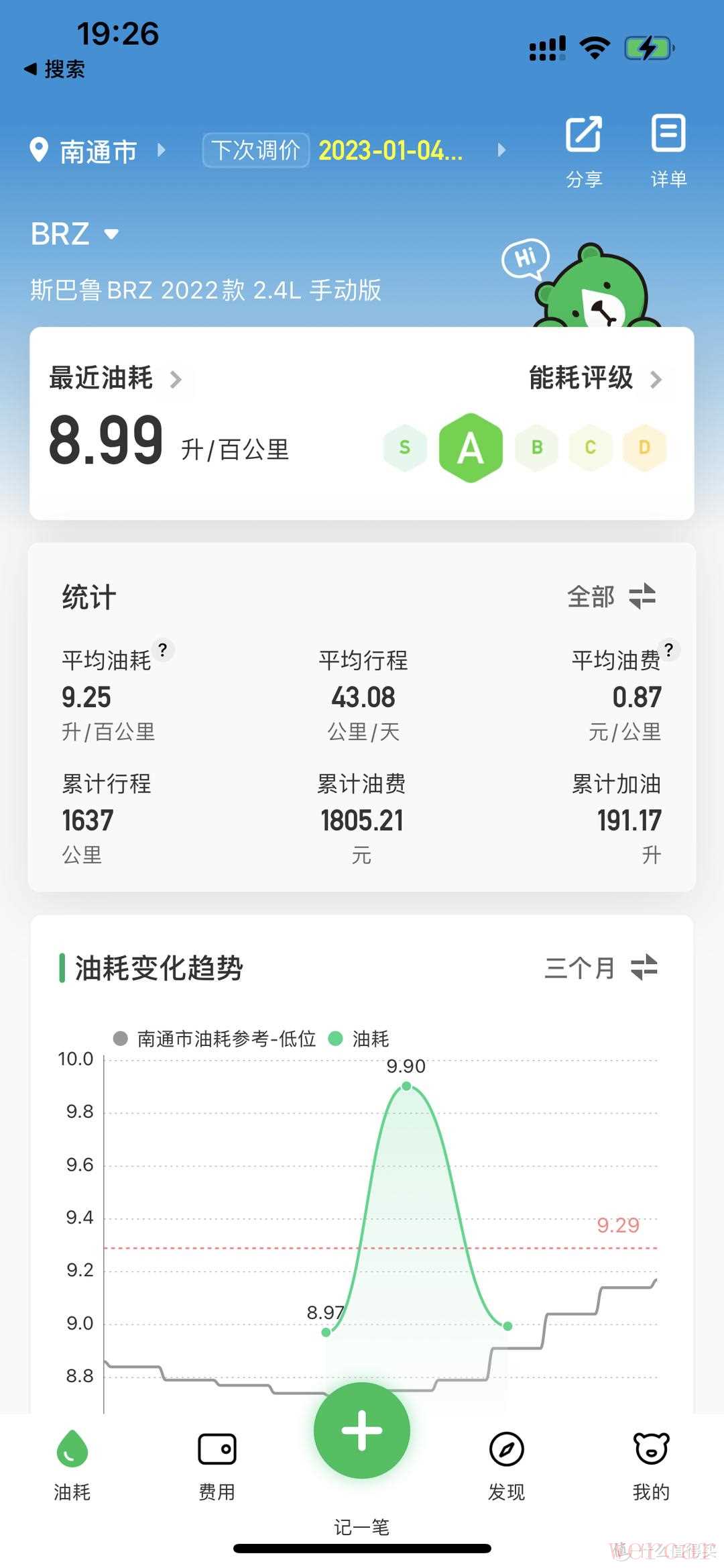 小熊油耗截图油耗大家一定要做好准备,我提车两千公里后平均时速39km/h,表显8.6升,实际在9个油,本人一直中石化98伺候。官方手册写的就是用98号油,95只可以应急,而且中石化每次98加油超过300都是有优惠券的,基本每次都有30块或以上的优惠,考虑到每次加油40L的话,其实一箱油之比在中石化95贵十块钱左右,我觉得可以接受。据群友们反馈,如果激进驾驶基本都是在10个油往上。对了,BRZ油表亮灯至少还能跑一百公里,这一点也是让人大吃一惊。