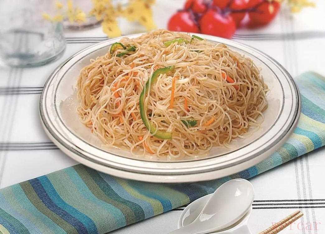 将肉丝、蛋丝、菜丝等配料放入锅里炒至将熟,再将已预制的米粉放入配料伴粉约2分钟即可。