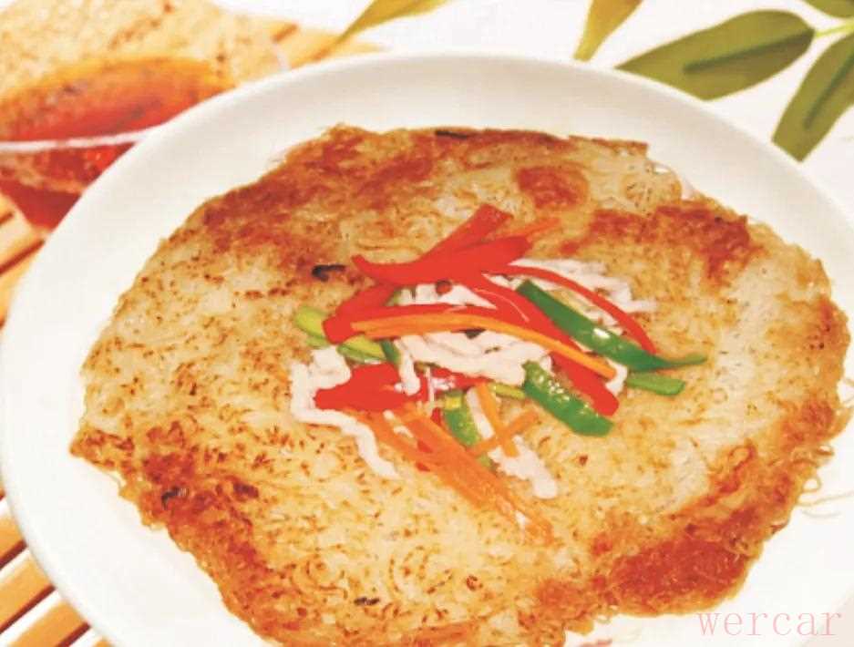净锅加热下油,然后放入已预制的米粉(肉茸夹心),慢火煎至呈金黄色即可。