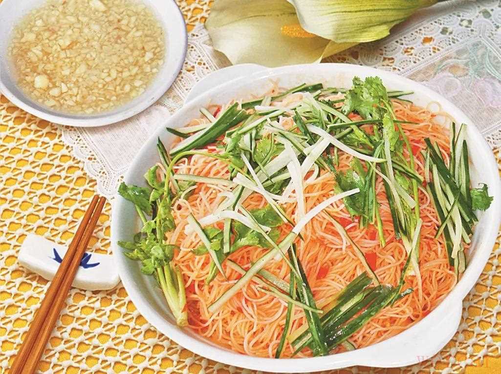 将已预制的米粉置雪柜急冻后,取出与杂锦菜、麻油、白糖、浙醋、香芝麻等配料拌匀上碟。