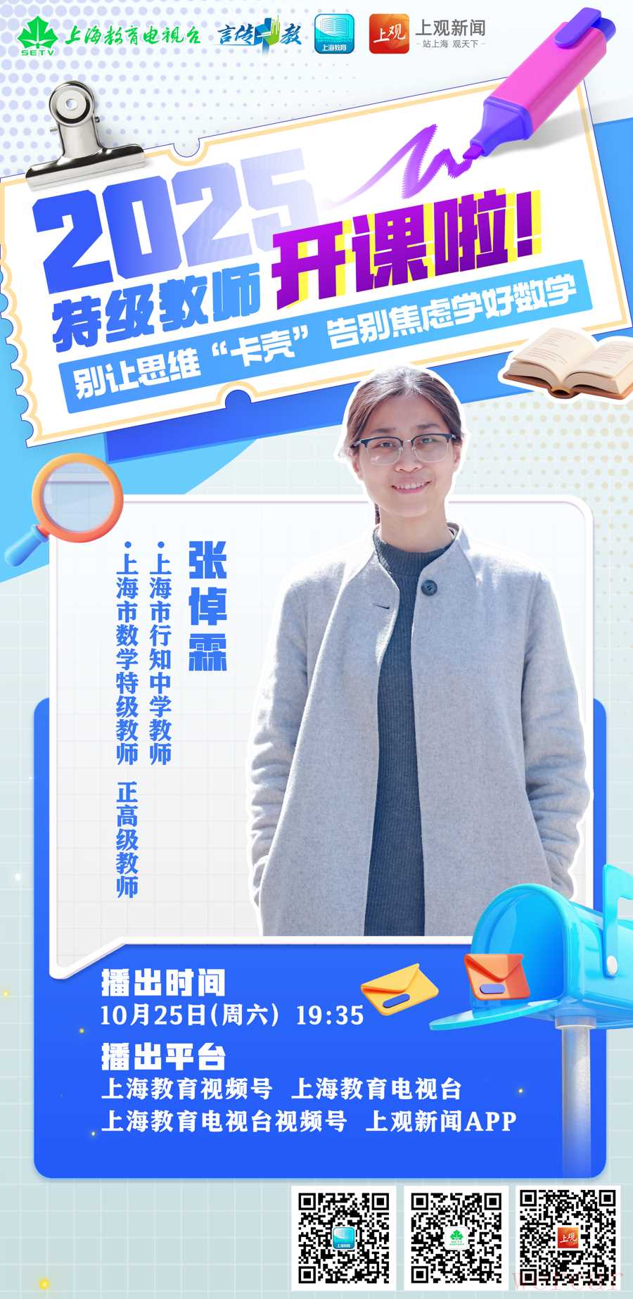 扫二维码收看上观新闻APP播出2025“特级教师开课啦”讲座《别让思维“卡壳”,告别焦虑学好数学》。