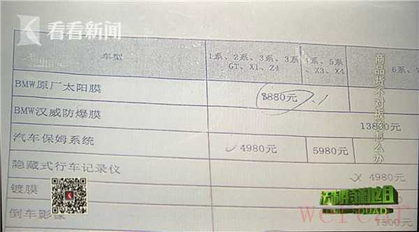 今年年初,罗先生为了换掉旧车,在德宝北青4S店选购了一辆宝马轿车。销售告诉罗先生,要买这辆车,必须要搭配相应的装潢项目。因此,罗先生在项目中选择了贴车膜,并在宝马原厂膜和德国汉威之间选择了比较贵的汉威原厂防爆膜。