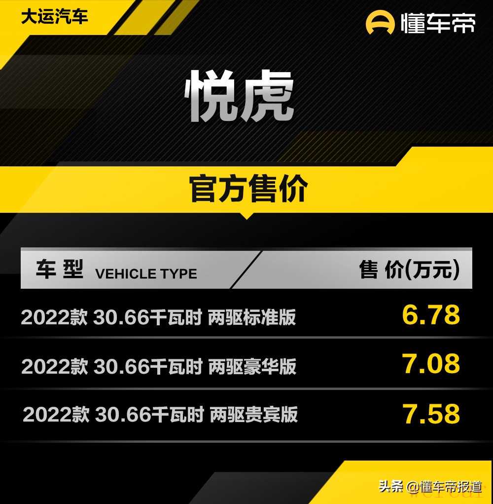 7月8日,大运新能源宣布,2022款悦虎正式上市,新车推出3款车型可选,售价区间为6.78万-7.58万元。