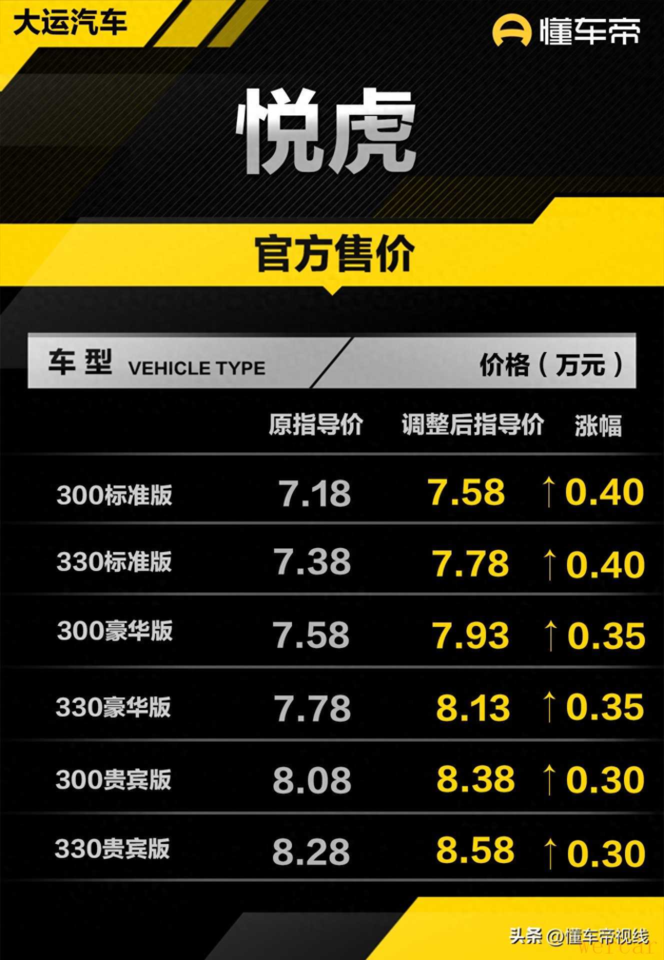 日前,我们从大运汽车获悉,旗下悦虎系列全系价格调整,涨幅在3000元-4000元,调整后官方指导价区间为7.58万元-8.58万元。各款车型详细价格请见下表: