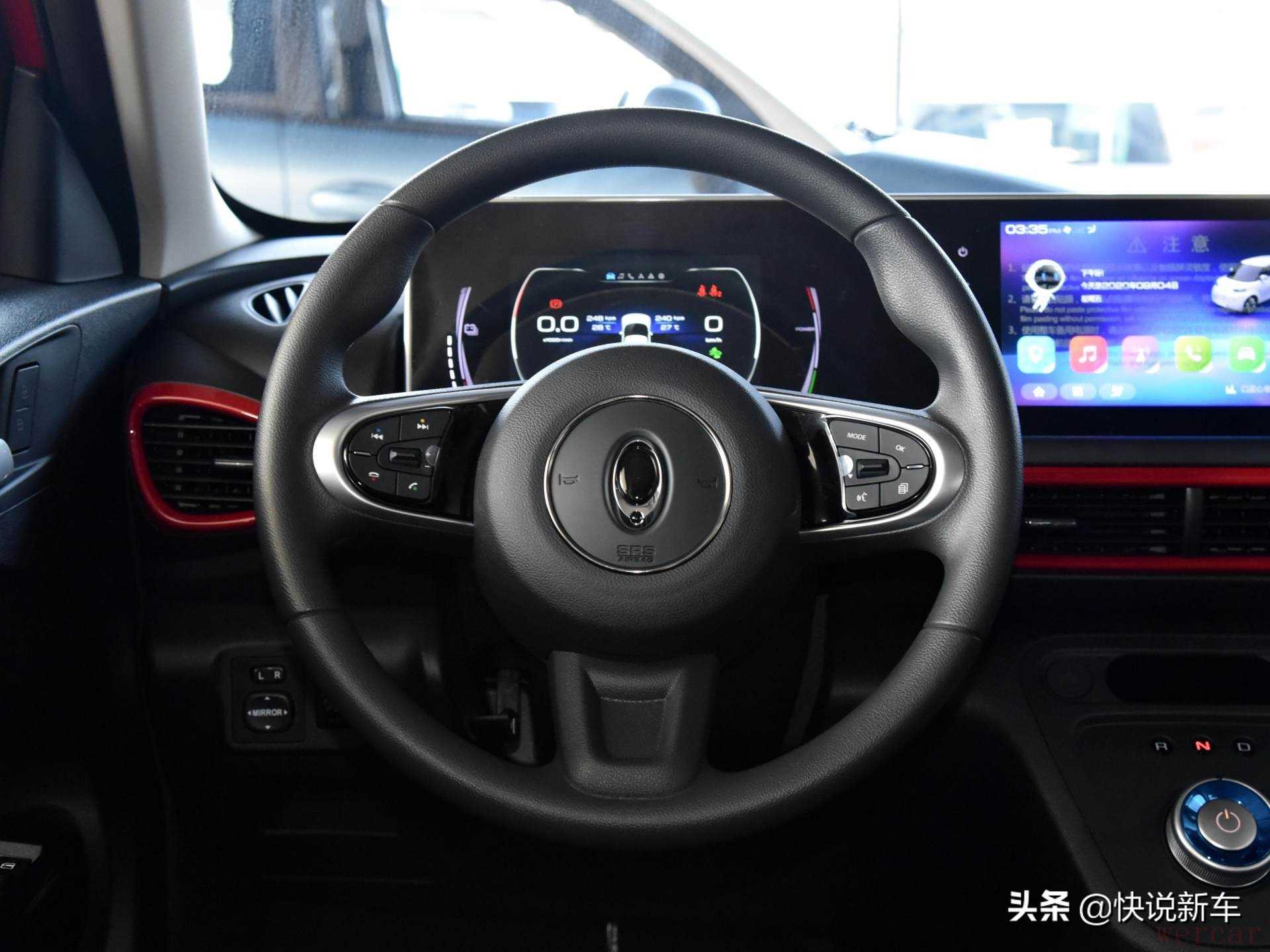 欧拉白猫的三辐式方向盘,质地稍显普通,采用搪塑材料,配备方向盘上、下、手可调。同时,该车仪表呈现出独特的设计风格、独特的造型和完整的功能。