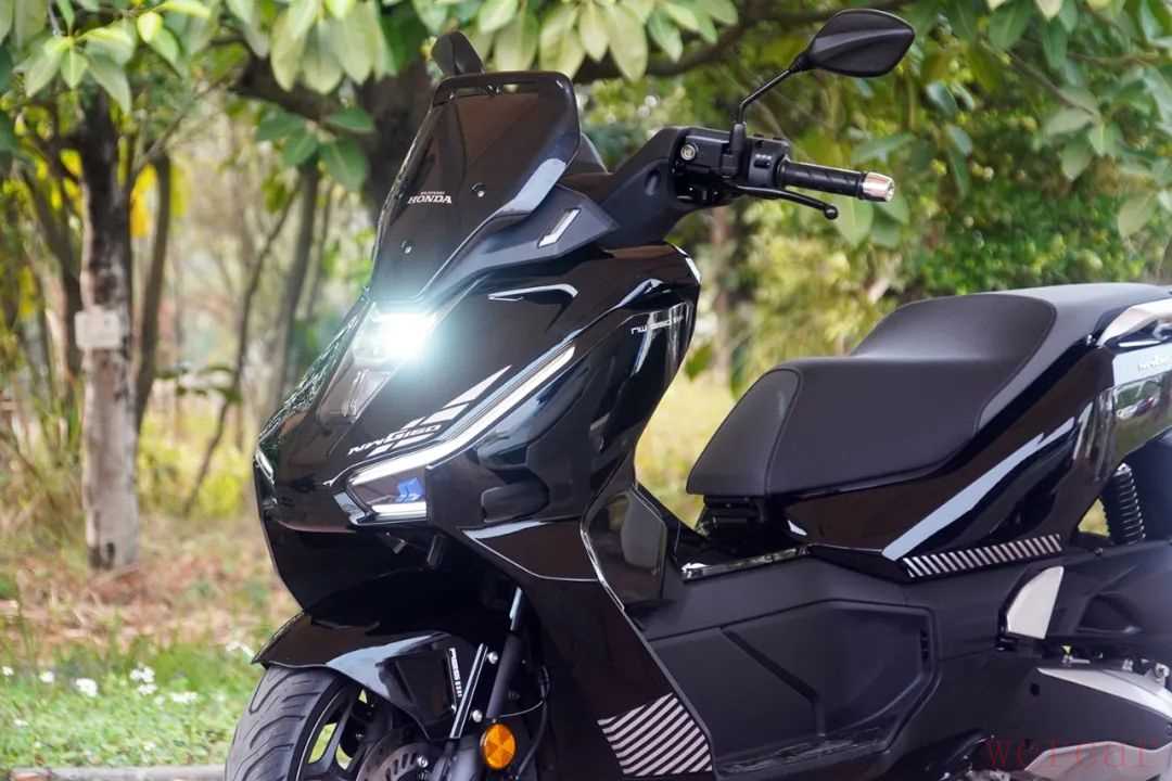 NWG150的车头乍一看去似乎与今年另一款采用三头灯设计的车型异曲同工,但实际上NWG的左右两侧均为高亮的日间行车灯条(位置灯)设计,真正的头灯是中间竖直排列的两组折射式LED发光单元。比较可惜的是试驾时间有限并没有夜间骑行的机会,但可以确定的是即便是在日光照射强烈的白天,NWG150的灯光依然很刺眼。