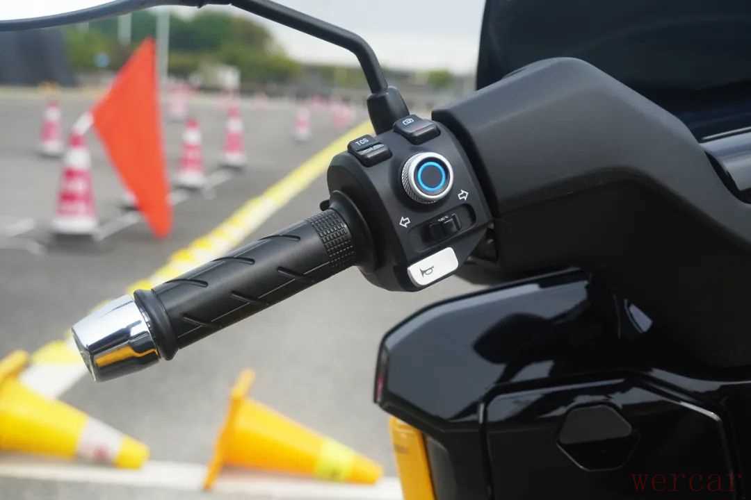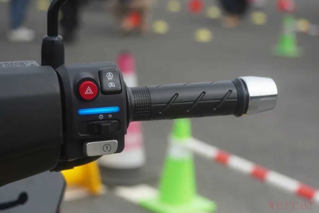 为了与这块屏幕的交互匹配,NWG150的开关组件并没有采用通用组件,而是单独开发了一套带有旋钮滚轮的开关总成,整体质感和手感要比市面上常见的公模开关组精致,这类比较科技化的组件其实更容易在当前高端电摩上看到,简明直接的按键交互逻辑更受年轻人喜爱。与自家F125一样,NWG150的开关组也支持蓝牙连接大疆Action4、5运动相机以及后续机型。