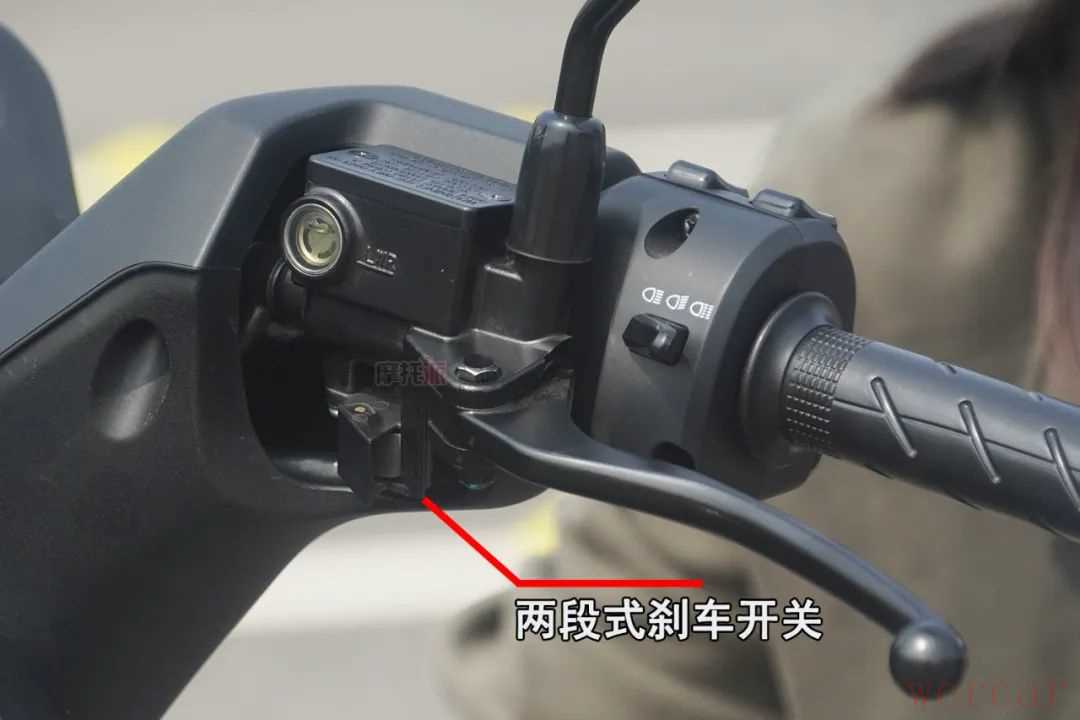 值得注意的是这款具备脉冲无声启动的eW15发动机在启动过程中并不是简单的带上刹车按点火开关即可。为了确保安全,NWG150并没有采用普通车款常见的刹车开关,而是刻意调整为两段式开关,轻拉刹车手把的第一段用于触发刹车灯,稍微用力到真正的刹车有效行程时,才能触发第二段开关用于发动机启动。在这样的细节之处,NWG150真正表现出了五羊-本田以人为本以安全为重的用心。