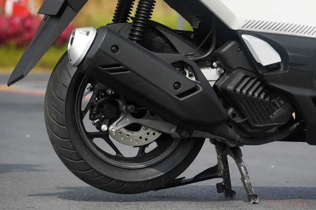 而在减震调校方面,五羊-本田这次似乎在新车上加入了一丝跨界风格加长了减震活动行程,前减震为一对31mm叉芯直径的正置液压减震,遗憾的是原厂并没有为前减震配备防尘套,不过NWG150的双侧后减震带有五级预载可调能力。这套减震在NWG150总体被设置为偏舒适性但又兼具韧性的调校,在高速通过减速带时即便轮胎已经被弹起离开地面,实际体感上颠簸仍然被有效的化解,并没有明确和剧烈的触底感受。与此同时,高速回旋的支撑性并没有被削弱,让人不得不叹服五羊-本田在调校上的功力。